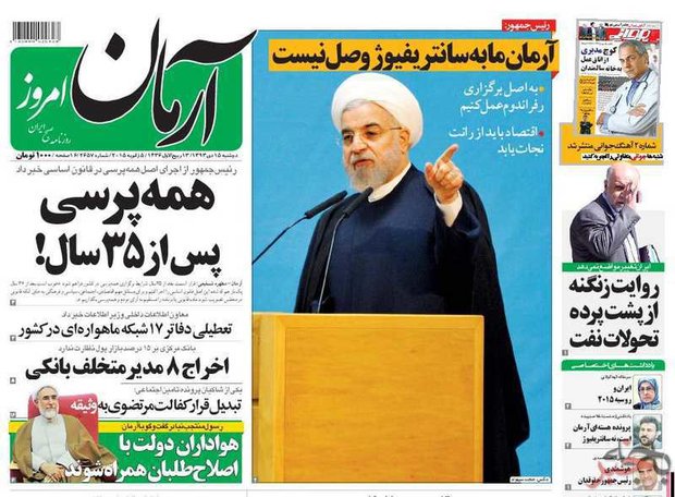 رییس جمهور اگر به روبرو بود ، این نظر را القا میکرد که روحانی مستقیم با من مخاطب روزنامه در حال گفت و گو است ، اما روحانی نگاهش به پایین است ، اما از آن مهمتر صندلیهای کنار رییس جمهور خالی است ،یک فضای خالی انگار کسی حامی رییس جمهور نیست تا اقتصاد را از سیاست خالی کند. ضمن آن که عکس وزرا با تیترها مستقل هم کمکی به بهبود صفحه و عکس یک نکرده است . روزنامه آرمان همسو و حامی دولت تیتر یک و عکس یک را به رییس جمهور میدهد و موضوع رفراندوم را تیتر یک و موضوع آرمان و سانتریفیوژ را عکس یک اینکه مجزا از هم عکس یک و تیتر یک به